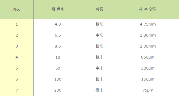 ※ 위의 표는 체 눈 열림의 대표적인 예 ※ 일본약국방은 JIS Z 8801 시험용 체를 인용하고 있으므로 일반 시험용 체로 대응할 수 있습니다. >>망 체의 제품 페이지