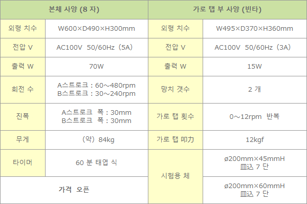 본 기기는 바닥면의 8자형 평면 회전 운동에 의해 분체 시료 등을 체망 전체에 회전시키며 분산시키므로 입자 분포가 우수합니다. 동시에 각 단의 시험용 체에 횡탭형 Winter 타격력이 가해져 체가름 진행을 더욱 빠르게 합니다. 효율적인 체가름으로 시간을 단축하고 높은 정밀도의 체가름이 가능합니다.