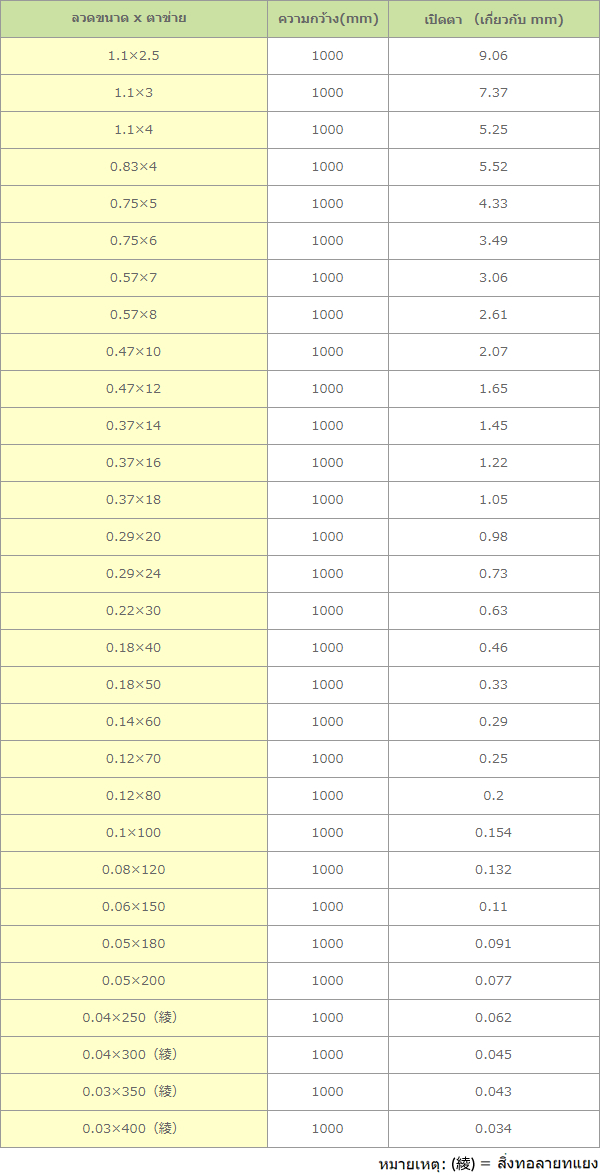 ตารางมาตรฐานลวดตาข่ายต่างๆ
