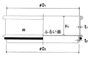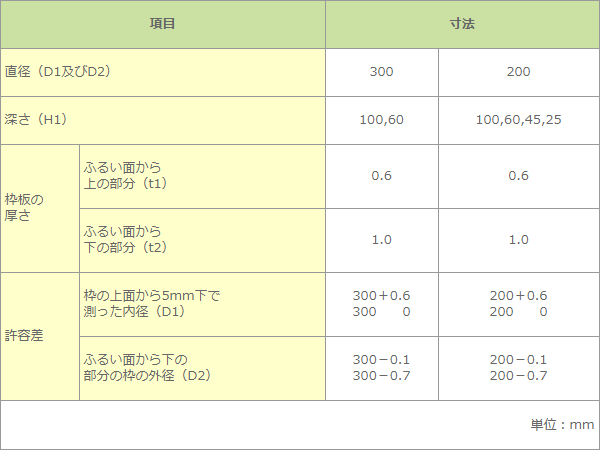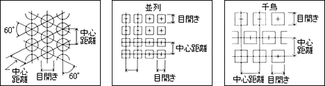 板は、金属板に垂直に円孔(円形目)又は角孔(正方目)をあけたものとする。円孔の配列は、図のように円孔の中心を結ぶ直線がなす角度を60°とし、角孔の配列は図のように並列又は千鳥配列とする。いずれの場合も、ふるい目の中心距離は同じとする。