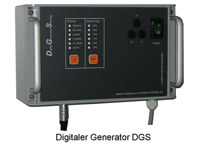 デジタル制御式DGS発信機は、超音波周波数30kHz~38kHzの作動周波数帯において、接続される金属の形状・固有振動数に左右されること無く、最適な周波数を持って超音波振動を印加することが可能です。専用のPCソフトウェアを用いる事で、周波数幅・スイープ回数等の条件設定を行う事ができます。JIS Z 8801試験用ふるいをバンド交換のみで着脱可能なことはもとより、色々なフレーム形状のふるいで使用可能という幅広い対応力を備えております。ふるい分け効率アップ、目詰まり軽減・防止、洗浄回数の低減、等々ふるい分け現場での作業効率アップを図る事が可能です。